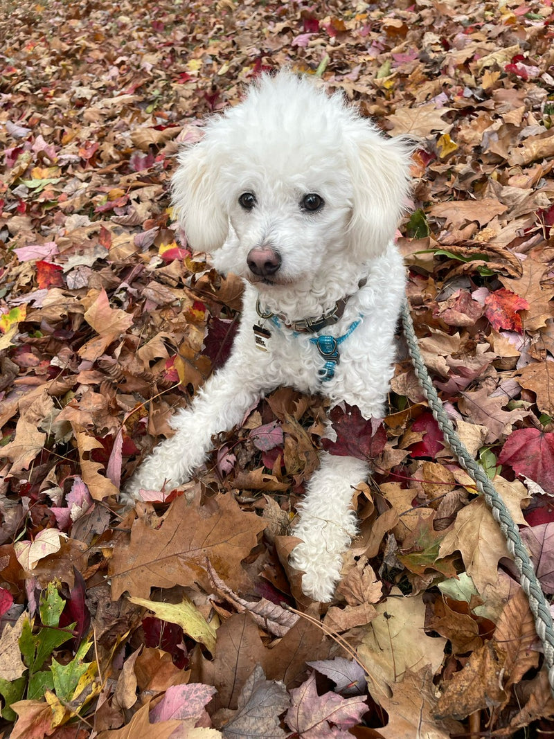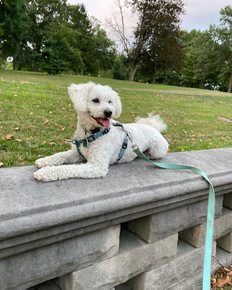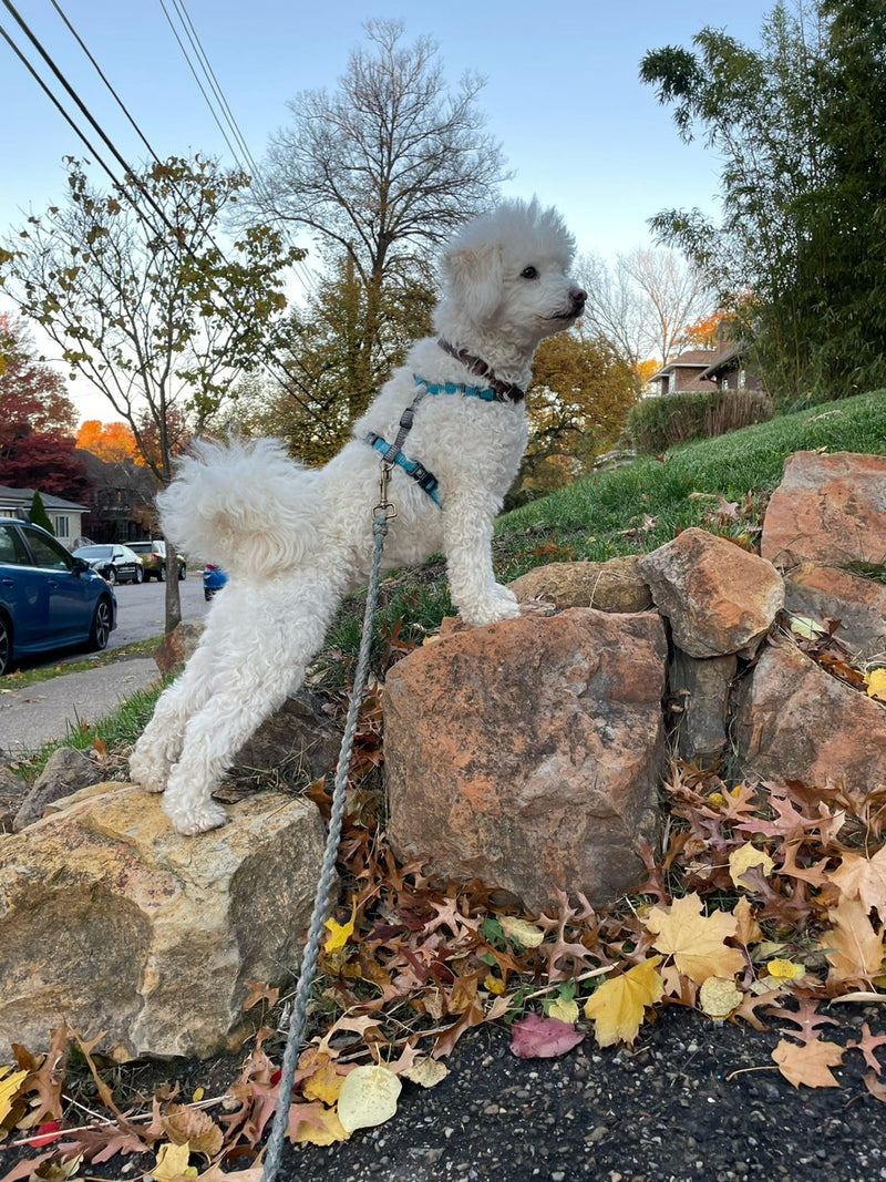 "Adora is a 5 year old rescued miniature poodle mix who was surrendered from a hoarding situation. She has come a long way with her healing journey in the last two years since she was adopted on 12/21/23, slowly but surely learning to trust new people and situations. Adora, loves meeting new canine friends; training in scentwork, parkour, rally obedience, and tricks; and is happiest when she gets to go hiking and climbing in the woods. She is living proof that little white fluffy dogs are 100% just as much dogs as their bigger counterparts."